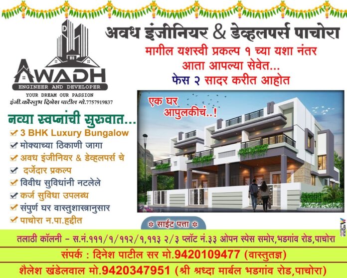 पाचोरा – शहरातील तलाठी कॉलनी येथे उभारण्यात येत असलेल्या अवध इंजिनियरिंग अँड डेव्हलपर्स या प्रतिष्ठित प्रकल्पाच्या फेस 2, 3BHK लक्झरी बंगलो प्रकल्पाचा भूमिपूजन सोहळा गुरुवारी, दि. 16 जानेवारी 2025 रोजी सकाळी 9.30 वाजता होणार आहे.