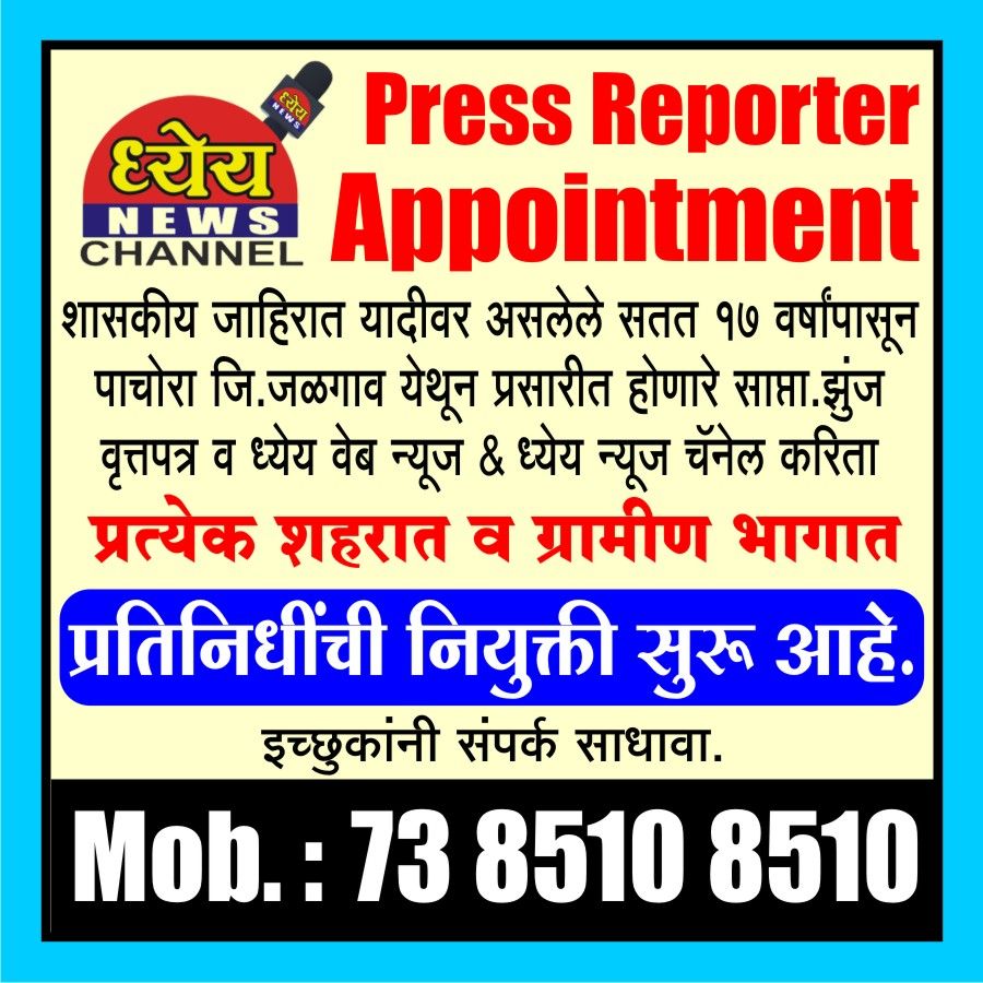 ध्येय न्यूज चॅनेलच्या बातम्या मिळवण्यासाठी येथे क्लिक करून आमचा व्हाट्सअप ग्रुप जॉईन करा.