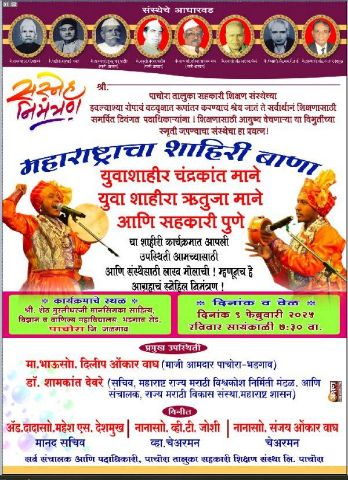 पाचोरा – येथील पाचोरा तालुका सहकारी शिक्षण संस्थेच्या वतीने, संस्थेच्या दिवंगत पदाधिकाऱ्यांच्या पुण्यस्मरणानिमित्त, श्री शेठ मुरलीधरजी मानसिंगका साहित्य, विज्ञान व वाणिज्य महाविद्यालयाच्या प्रांगणात, दिनांक 9 फेब्रुवारी 2025 रोजी सायंकाळी 7:30 वाजता “शाहिरी बाणा” या विशेष कार्यक्रमाचे आयोजन करण्यात आले आहे.