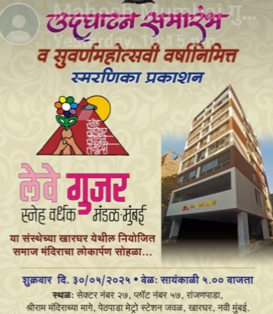 खारघर, नवी मुंबई – लेवे गुजर स्नेहवर्धक मंडल, मुंबई द्वारा खारघर में निर्मित समाज मंदिर का भव्य लोकार्पण समारोह एवं संस्था के स्वर्ण जयंती वर्ष के उपलक्ष्य में प्रकाशित होने वाली विशेष स्मरणिका का विमोचन समारोह दिनांक 30 मई 2025 को शाम 5 बजे बड़े उत्साह और हर्षोल्लास के साथ संपन्न होने जा रहा है। यह समारोह केवल एक सामाजिक आयोजन नहीं है, बल्कि यह समाज के लिए पिछले 50 वर्षों से कार्य कर रहे कार्यकर्ताओं की मेहनत और समर्पण को मान्यता देने वाला ऐतिहासिक अवसर है।