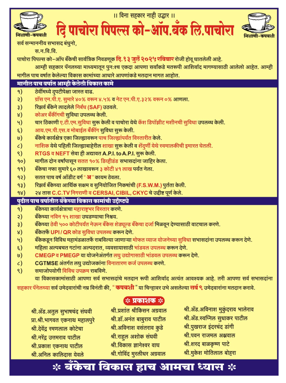 दि पाचोरा पीपल्स बँकेच्या निवडणुकीच्या पार्श्वभूमीवर सहकार पॅनेलच्या वतीने प्रसिद्ध करण्यात आलेल्या परिपत्रकात काही गोष्टी मांडण्यात आल्या आहेत. त्या वाचून एक जबाबदार सभासद म्हणून आमच्या मनात काही प्रश्न निर्माण होणे स्वाभाविक आहे. तेच प्रश्न तुमच्यासमोर सादर करत आहोत. हे उत्तर विरोधासाठी नाही, तर विचारासाठी आहे.