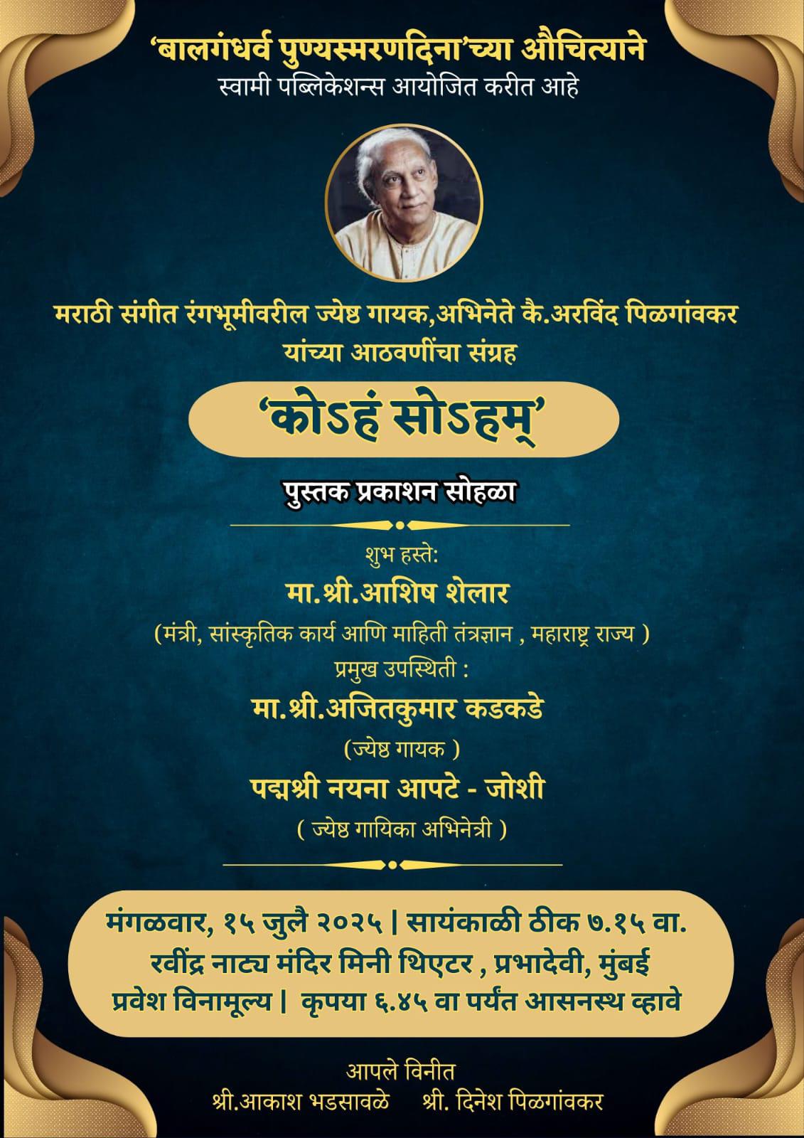 मुंबई (गुरुदत्त वाकदेकर) : मराठी संगीत रंगभूमीच्या परंपरेत लक्षणीय स्थान लाभलेले ज्येष्ठ गायक नट अरविंद पिळगांवकर यांच्या स्मृतिप्रीत्यर्थ त्यांच्या आत्मकथनात्मक लेखनाचा संपादित संग्रह ‘कोsहं सोहम्’ रसिकांच्या हाती येणार आहे. त्यांच्या समृद्ध कारकिर्दीत आलेल्या अनुभवांचे सजीव लेखन बालगंधर्वांच्या पुण्यस्मरण दिनाचे औचित्य साधून प्रकाशित होत आहे. या पुस्तकाचा प्रकाशन सोहळा मंगळवार, १५ जुलै २०२५ रोजी सायंकाळी ७:१५ वाजता मुंबईतील रवींद्र नाट्य मंदिर, प्रभादेवी (मिनी थिएटर) येथे संपन्न होणार आहे.