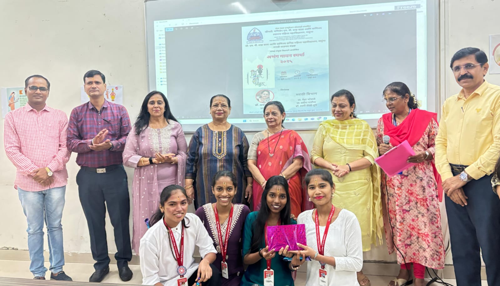 या दिवशी महाविद्यालयातील मराठी वाड्मय मंडळाच्या वतीने आयोजित “अभंग गायन स्पर्धा २०२५” मध्ये एकूण ७१ विद्यार्थिनींनी उस्फूर्त सहभाग नोंदवून संतवाङ्मयाचा गोडवा आणि अभंगांची भक्तिरसाळ परंपरा रसिकांसमोर उलगडली.