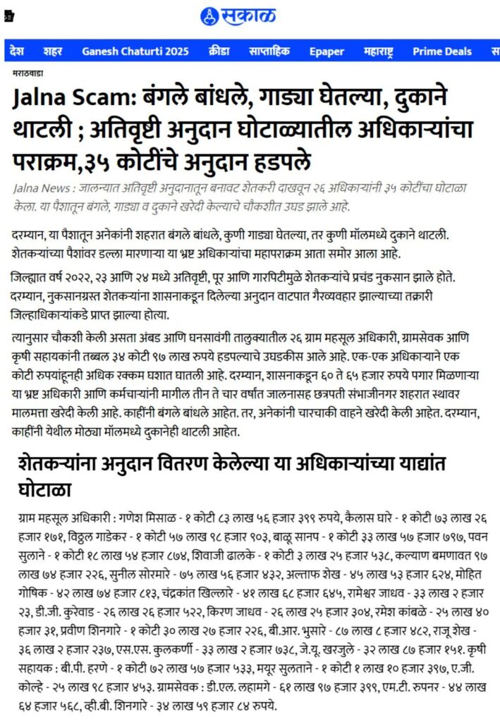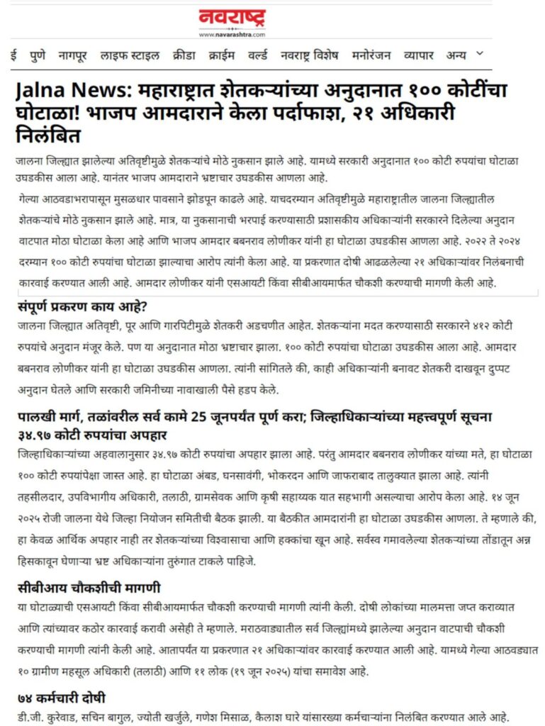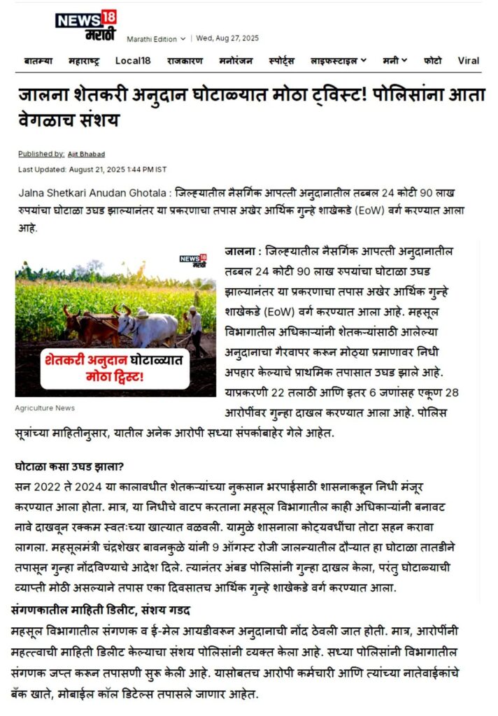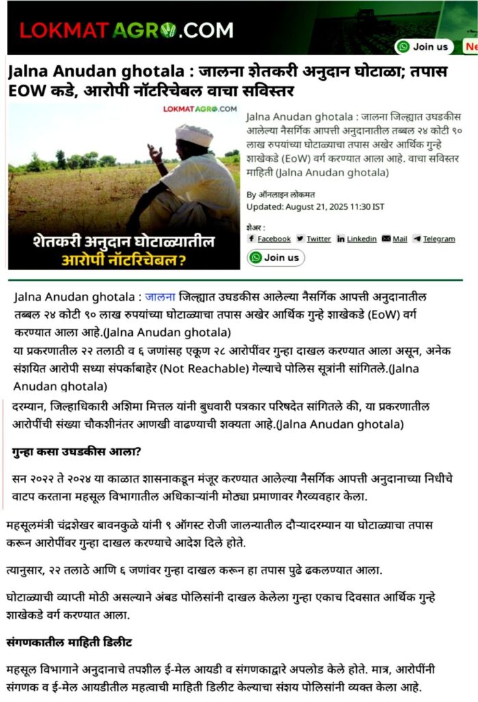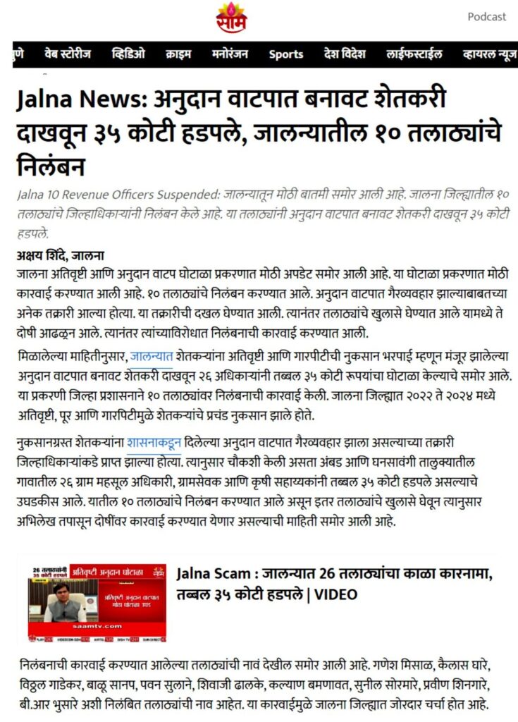 पाचोरा – शेतकरी बांधवांनो, आपल्या हक्काच्या पैशावर प्रशासनातील काही भ्रष्ट कर्मचारी-अधिकाऱ्यांनी गदा आणली आहे. जालना जिल्ह्यात फक्त एका वर्षात तब्बल ३५ कोटींचा अनुदान घोटाळा उघडकीस आला असून, यामध्ये २२ तलाठी आणि ६ जणांवर गुन्हा दाखल झाला आहे. हा प्रकार थेट शेतकऱ्यांच्या न्यायावरचा घाव आहे. आश्चर्याची बाब म्हणजे, पाचोरा तालुक्यातही याच धर्तीवर गैरव्यवहार झाल्याचे धक्कादायक वास्तव समोर आले आहे. सन २०२३-२४ मध्ये अतिवृष्टीग्रस्त शेतकऱ्यांसाठी मंजूर झालेले ७० कोटींच्या अनुदानापैकी काही लाख रुपये परस्पर इतरांच्या खात्यात वळवून हडप करण्यात आल्याचे सिद्ध झाले आहे. शेतकरी बांधवांनो, फक्त दोन-चार शेतकऱ्यांनी धाडसाने तक्रार दिली आणि महसूल प्रशासन गडबडीत सर्व कामाला लागले. आता कर्मचाऱ्यांनी शेतकऱ्यांच्या दारापुढे जाऊन खात्यात पैसे टाकण्यास सुरुवात केली आहे. पण हा तात्पुरता उपाय आहे. मोठ्या प्रमाणावर अनुदान कोठे गेले? किती रक्कम कोणत्या अधिकाऱ्यांनी गिळंकृत केली? हे सत्य बाहेर आलेच पाहिजे. यासाठी मागणी केली जात आहे की सन २०१९-२० पासून ते २०२५ पर्यंत शेतकऱ्यांना मिळालेल्या सर्व अनुदानांची वर्षनिहाय यादी PDF स्वरूपात जाहीर व्हावी. प्रत्येक गावाच्या स्वतंत्र यादीत लाभधारकाचे नाव, मंजूर झालेली रक्कम, प्रत्यक्ष दिलेली रक्कम आणि न मिळाल्यास कारण याची स्पष्ट नोंद असावी. ही यादी गावोगावी तलाठी, ग्रामसेवक, सरपंच, उपसरपंच, ग्रामपंचायत सदस्य, सोसायटी पदाधिकारी तसेच स्थानिक पत्रकार यांना व्हॉट्सअॅपवर पाठवावी. शेतकरी बांधवांनो, आपण प्रत्येकाने जागरूक राहिले पाहिजे. सध्याचे पैसे मिळाले असतील, पण मागील वर्षांचे काय? आपल्या जवळ असलेली माहिती, कागदपत्रे आणि पुरावे यांची प्रत जोडून ती पत्रकार संदीप दामोदर महाजन, गणेश कॉलनी, पुनगाव रोड, पाचोरा – Mo. 7385108510, 7588645907 यांच्याकडे द्यावीत. जालना घोटाळ्याचा स्फोट राज्यभरात झाला आहे. त्याच धर्तीवर पाचोर्यातील सत्य बाहेर काढणे ही आपली जबाबदारी आहे. शेतकरी बांधवांनो, आज आपण आवाज उठवला नाही तर उद्या आपलेच भविष्य धोक्यात येईल. म्हणूनच आता जागे व्हा, संघटित व्हा आणि आपल्या हक्काच्या न्यायासाठी लढा उभारा!