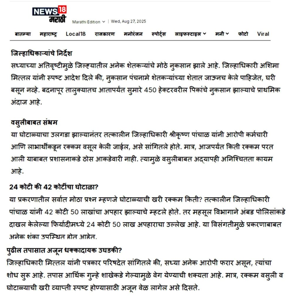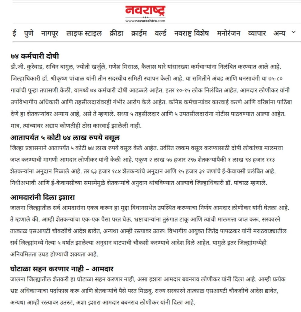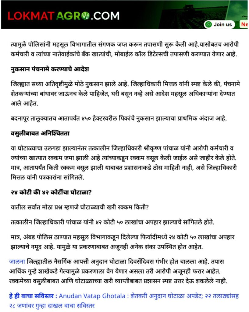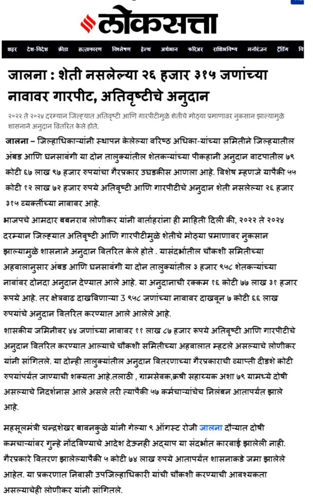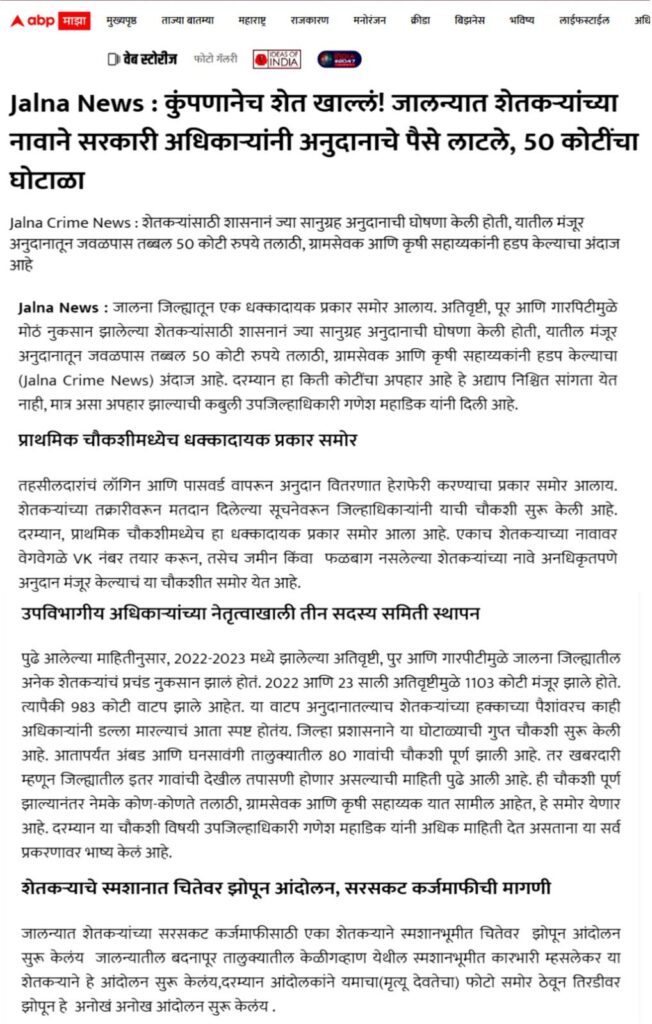पाचोरा – शेतकरी बांधवांनो, आपल्या हक्काच्या पैशावर प्रशासनातील काही भ्रष्ट कर्मचारी-अधिकाऱ्यांनी गदा आणली आहे. जालना जिल्ह्यात फक्त एका वर्षात तब्बल ३५ कोटींचा अनुदान घोटाळा उघडकीस आला असून, यामध्ये २२ तलाठी आणि ६ जणांवर गुन्हा दाखल झाला आहे. हा प्रकार थेट शेतकऱ्यांच्या न्यायावरचा घाव आहे. आश्चर्याची बाब म्हणजे, पाचोरा तालुक्यातही याच धर्तीवर गैरव्यवहार झाल्याचे धक्कादायक वास्तव समोर आले आहे. सन २०२३-२४ मध्ये अतिवृष्टीग्रस्त शेतकऱ्यांसाठी मंजूर झालेले ७० कोटींच्या अनुदानापैकी काही लाख रुपये परस्पर इतरांच्या खात्यात वळवून हडप करण्यात आल्याचे सिद्ध झाले आहे. शेतकरी बांधवांनो, फक्त दोन-चार शेतकऱ्यांनी धाडसाने तक्रार दिली आणि महसूल प्रशासन गडबडीत सर्व कामाला लागले. आता कर्मचाऱ्यांनी शेतकऱ्यांच्या दारापुढे जाऊन खात्यात पैसे टाकण्यास सुरुवात केली आहे. पण हा तात्पुरता उपाय आहे. मोठ्या प्रमाणावर अनुदान कोठे गेले? किती रक्कम कोणत्या अधिकाऱ्यांनी गिळंकृत केली? हे सत्य बाहेर आलेच पाहिजे. यासाठी मागणी केली जात आहे की सन २०१९-२० पासून ते २०२५ पर्यंत शेतकऱ्यांना मिळालेल्या सर्व अनुदानांची वर्षनिहाय यादी PDF स्वरूपात जाहीर व्हावी. प्रत्येक गावाच्या स्वतंत्र यादीत लाभधारकाचे नाव, मंजूर झालेली रक्कम, प्रत्यक्ष दिलेली रक्कम आणि न मिळाल्यास कारण याची स्पष्ट नोंद असावी. ही यादी गावोगावी तलाठी, ग्रामसेवक, सरपंच, उपसरपंच, ग्रामपंचायत सदस्य, सोसायटी पदाधिकारी तसेच स्थानिक पत्रकार यांना व्हॉट्सअॅपवर पाठवावी. शेतकरी बांधवांनो, आपण प्रत्येकाने जागरूक राहिले पाहिजे. सध्याचे पैसे मिळाले असतील, पण मागील वर्षांचे काय? आपल्या जवळ असलेली माहिती, कागदपत्रे आणि पुरावे यांची प्रत जोडून ती पत्रकार संदीप दामोदर महाजन, गणेश कॉलनी, पुनगाव रोड, पाचोरा – Mo. 7385108510, 7588645907 यांच्याकडे द्यावीत. जालना घोटाळ्याचा स्फोट राज्यभरात झाला आहे. त्याच धर्तीवर पाचोर्यातील सत्य बाहेर काढणे ही आपली जबाबदारी आहे. शेतकरी बांधवांनो, आज आपण आवाज उठवला नाही तर उद्या आपलेच भविष्य धोक्यात येईल. म्हणूनच आता जागे व्हा, संघटित व्हा आणि आपल्या हक्काच्या न्यायासाठी लढा उभारा!