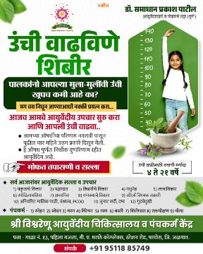 संपर्क क्रमांक: 9511885749 पालकांनो, तुमच्या मुलांच्या उज्ज्वल भविष्याकरिता ही सुवर्णसंधी गमावू नका. श्री विश्वरेणू आयुर्वेदिय चिकित्सालय येथे उपलब्ध असलेल्या खात्रीशीर आयुर्वेदिक उपचारांमुळे कमी उंची ही समस्या नव्हे तर आयुष्यातील एक सोपा टप्पा ठरू शकतो. आत्मविश्वासाने भरलेले, निरोगी आणि आकर्षक व्यक्तिमत्त्व असलेले भविष्य तुमच्या मुलांची वाट पाहत आहे.