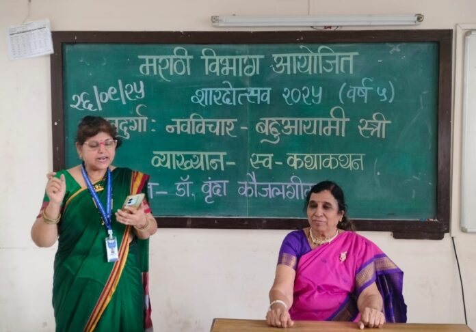 मुंबई (गुरुदत्त वाकदेकर) : सेवा मंडळ एज्युकेशन सोसायटी संचालित श्रीमती एम.पी. शाह महिला महाविद्यालयाच्या मराठी विभागात शारदोत्सव २०२५ (पाचवे वर्ष) अंतर्गत ‘नवदुर्गा : नवविचार’ व्याख्यानमालेचे आयोजन करण्यात आले. या व्याख्यानमालेत पाचवे पुष्प म्हणून ‘स्व-कथाकथन’ या विषयावर व्याख्यात्या, लेखिका आणि कथाकथनकार डॉ. वृंदा कौजलगीकर यांनी व्याख्यान सादर केले. कार्यक्रमास विद्यार्थिनींसह प्राध्यापकवृंद आणि शिक्षकेतर कर्मचारी मोठ्या संख्येने उपस्थित होते. स्त्री उपजतच सृजनशील असून तिचं योगदान केवळ कुटुंबापुरतं मर्यादित न राहता साहित्य, कला आणि संस्कृतीच्या क्षेत्रात ठसा उमटवते, असे त्यांनी स्पष्ट केले.