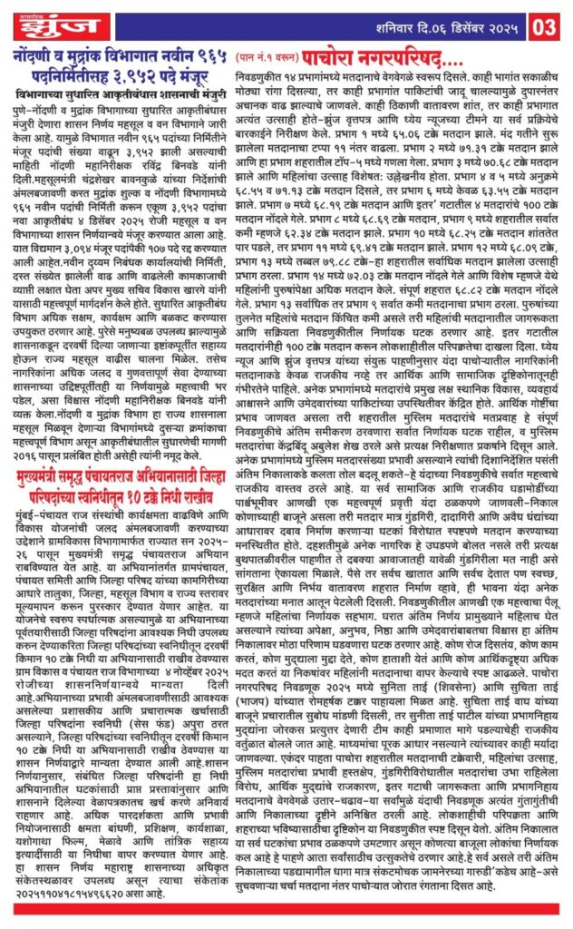 पाचोरा – शहरातील नगरपरिषद निवडणुकीचे मतदान यंदा शांत, सुटसुटीत आणि शिस्तबद्ध पद्धतीने पार पडले. सकाळपासूनच नागरिकांनी उत्साहाने मतदान केंद्रांकडे धाव घेतली. कुठेही गोंधळ नाही, पोलिस आणि कर्मचारी यांनी उत्तम समन्वय ठेवला, आणि नागरिकांनी लोकशाहीचा हक्क व्यक्त करण्यासाठी मोठ्या प्रमाणात पुढे येत मताधिक्याची नोंद केली. ध्येय न्यूज आणि झुंज वृत्तपत्रच्या प्रत्यक्ष पाहणीत शहरातील सर्वसामान्य मतदार यंदा मतदानाबाबत अधिक सजग आणि जबाबदार दिसून आला. “आपल्या शहराचा कारभार आपणच ठरवायचा” ही भावना सतत प्रकर्षाने जाणवत होती. पाचोरा शहरातील एकूण 59,084 मतदारांपैकी पुरुष 30,049, महिला 29,037 आणि इतर गटातील 6 मतदार आहेत. हे तिन्ही गट मिळून शहराचे लोकशाहीचे भक्कम आधारस्तंभ आहेत. पुरुष आणि महिलांचे प्रमाण जवळपास समान असल्याने निवडणुकीचा तोलही दोन्हीकडून सारखाच राखला जातो. यंदाच्या निवडणुकीत 40,660 मतदारांनी मतदानाचा हक्क बजावला. त्यात पुरुषांनी 20,990, महिलांनी 19,664 तर इतर गटातील सर्व 6 मतदारांनी 100 टक्के सहभाग नोंदवला. पुरुषांचे मतदान किंचित जास्त असले तरी महिलांचा सहभागही महत्त्वाचा व निर्णायक राहिला. दुपारनंतर महिलांचे गटाने घराबाहेर पडणे दिसल्याने शेवटच्या दोन तासांत मतदानाचा वेग वाढल्याचे ध्येय न्यूजच्या पाहणीत स्पष्ट दिसून आले. निवडणुकीत 14 प्रभागांमध्ये मतदानाचे वेगवेगळे स्वरूप दिसले. काही भागांत सकाळीच मोठ्या रांगा दिसल्या, तर काही प्रभागांत दुपारनंतर अचानक वाढ झाल्याचे जाणवले. काही ठिकाणी वातावरण शांत, तर काही प्रभागात अत्यंत उत्साही होते—झुंज वृत्तपत्र आणि ध्येय न्यूजच्या टीमने या सर्व प्रक्रियेचे बारकाईने निरीक्षण केले. प्रभाग 1 मध्ये 65.06 टक्के मतदान झाले. मंद गतीने सुरू झालेला मतदानाचा टप्पा 11 नंतर वाढला. प्रभाग 2 मध्ये 71.31 टक्के मतदान झाले आणि हा प्रभाग शहरातील टॉप-5 मध्ये गणला गेला. प्रभाग 3 मध्ये 70.68 टक्के मतदान झाले आणि महिलांचा उत्साह विशेषत: उल्लेखनीय होता. प्रभाग 4 व 5 मध्ये अनुक्रमे 68.55 व 71.13 टक्के मतदान दिसले, तर प्रभाग 6 मध्ये केवळ 63.55 टक्के मतदान झाले. प्रभाग 7 मध्ये 68.19 टक्के मतदान आणि ‘इतर’ गटातील 4 मतदारांचे 100 टक्के मतदान नोंदले गेले. प्रभाग 8 मध्ये 68.69 टक्के मतदान, प्रभाग 9 मध्ये शहरातील सर्वात कमी म्हणजे 62.34 टक्के मतदान झाले. प्रभाग 10 मध्ये 68.25 टक्के मतदान शांततेत पार पडले, तर प्रभाग 11 मध्ये 69.41 टक्के मतदान झाले. प्रभाग 12 मध्ये 68.09 टक्के, प्रभाग 13 मध्ये तब्बल 79.88 टक्के—हा शहरातील सर्वाधिक मतदान झालेला उत्साही प्रभाग ठरला. प्रभाग 14 मध्ये 72.03 टक्के मतदान नोंदले गेले आणि विशेष म्हणजे येथे महिलांनी पुरुषांपेक्षा अधिक मतदान केले. संपूर्ण शहरात 68.82 टक्के मतदान नोंदले गेले. प्रभाग 1