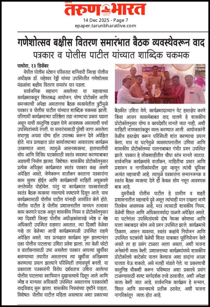 पाचोरा – जळगाव जिल्हा पोलीस अधीक्षक यांच्या हस्ते गणेशोत्सव मंडळांचे बक्षीस वितरण समारंभ पाचोरा शहरात पार पडला. या कार्यक्रमाचे आयोजन औपचारिकतेने, शिस्तबद्धतेने आणि पोलीस प्रशासनाच्या उपस्थितीत करण्यात आले होते. सार्वजनिक उत्सवांमध्ये शिस्त, सामाजिक भान आणि प्रशासनाचा सहभाग दाखविण्याच्या उद्देशाने अशा कार्यक्रमांचे महत्त्व निर्विवाद आहे. पोलीस स्टेशनला गुन्हा दाखल झाल्या नंतर बातमी मध्ये नांव टाकू नका किंवा बदल करा असे प्रकार घडत होते आता तर थेट पोलीस स्टेशनला गुन्हा दाखल झाल्याची बातमीच लपवली जाते ती का? आणि कोणासाठी व कोणाच्या हितासाठी हा संशोधनाचा विषय आहे मात्र सध्याची गंभीर बाब म्हणजे बक्षीस समारंभाच्या कार्यक्रमानंतर जे दृश्य समोर आले, त्याने पाचोरा शहर व तालुक्यातील पत्रकारितेच्या प्रतिष्ठेवर गंभीर प्रश्नचिन्ह उभे केले आहे. बक्षीस वितरण संपल्यानंतर उपस्थित मंडळांचे पदाधिकारी आणि अवघे मोजके सहा ते सात पत्रकार इतकीच संख्या असताना, पत्रकारांना स्पष्ट शब्दांत “आता जाण्यास हरकत नाही” असे सांगण्यात आले.( तरी सुद्धा काही बाईटच्या लालचेने तिथेच घुटमळत होते त्यांना सुद्धा जेवा म्हटले नाही हा भाग वेगळा) परंतु हे शब्द केवळ औपचारिक नव्हते, तर पत्रकारांच्या भूमिकेची, कष्टांची आणि लोकशाहीतील त्यांच्या स्थानाची अवहेलना करणारे होते. कार्यक्रम संपल्यानंतर पत्रकारांना निरोप देण्यात आला, मात्र त्याच ठिकाणी उपस्थित पोलीस पाटील आणि (महिला पोलीस पाटील यांचे पती ) यांच्यासाठी स्नेहभोजनाचा स्वतंत्र कार्यक्रम आयोजित करण्यात आल्याचे समोर आले. हा भेदभाव केवळ भोजनापुरता मर्यादित नव्हता, तर तो मानसिकतेचा, प्राधान्यक्रमांचा आणि सत्ताकेंद्रित संस्कृतीचा आरसा दाखवणारा होता. सार्वजनिक कार्यक्रमात बातमीदार म्हणून उपस्थित असलेले पत्रकार हे केवळ पाहुणे नसतात, तर त्या कार्यक्रमाची माहिती समाजापर्यंत पोहोचवणारे महत्त्वाचे दुवे असतात, तरीही त्यांना दुय्यम वागणूक देण्यात आली ही बाब चिंताजनक आहे. या घटनेमुळे एक प्रश्न प्रकर्षाने पुढे येतो, तो म्हणजे प्रशासन आणि काही अधिकारी आर्थिकदृष्ट्या गब्बर होत असताना काही पत्रकार मात्र लाचारी वृत्तीने किंवा परिस्थितीपुढे झुकत तर नाहीत ना? पत्रकारांच्या जिवावर बातम्या उभ्या राहतात, प्रशासनाची प्रतिमा उजळते किंवा मलीन होते, पण त्याच पत्रकारांना सन्मानाची वागणूक देण्याची वेळ आली की दुर्लक्ष केले जाते. शुद्ध शाकाहारी स्नेहभोजन ही केवळ पोटभर जेवणाची बाब नसून तो सन्मानाचा, समावेशकतेचा आणि परस्पर आदराचा प्रतीकात्मक संकेत असतो. त्या स्नेहभोजनातून पत्रकारांना वगळले जाणे म्हणजे अप्रत्यक्षपणे “तुमची 