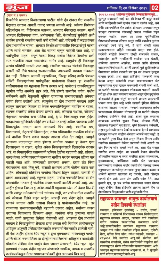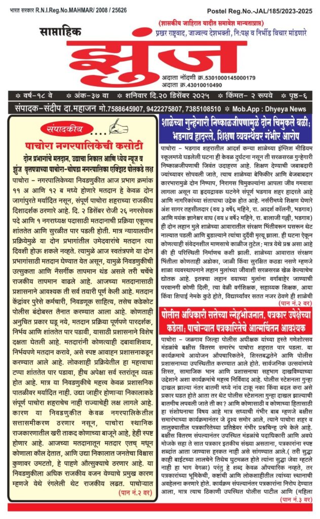 नगरपालिकेतील सत्तासमीकरण ठरणार नसून, पाचोरा स्थानिक राजकारणातील खरी ताकद कोणाच्या बाजूने आहे, हेही स्पष्ट होणार आहे. आजच्या मतदानातून मतदार EVM मधून कोणाला कौल देतात, आणि उद्या निकालात जनतेचा विश्वास कुणावर उमटतो, हे पाहणे औत्सुक्याचे ठरणार आहे. या निवडणुकीला अधिक राजकीय वजन येण्याचे प्रमुख कारण म्हणजे येथे रंगलेली थेट राजकीय लढत. पाचोऱ्यात शिवसेनेचे आमदार किशोरआप्पा पाटील यांनी दंड ठोकत थेट राजकीय मैदानात उतरून आपली ताकद पणाला लावली आहे. त्यांच्या विरोधात पहिल्यांदाच ना. गिरीषभाऊ महाजन, आमदार मंगेशदादा चव्हाण, माजी आमदार दिलीपभाऊ वाघ, अमोलभाऊ शिंदे, वैशालीताई सुर्यवंशी अशी एकत्रित प्रभावी राजकीय फळी उभी राहिली आहे. परिणामी ही लढत केवळ नगरपालीका मर्यादित न राहता, आमदार किशोरआप्पा पाटील विरुद्ध संपूर्ण भाजप आणि त्यांचे समर्थक, असा थेट सामना म्हणून पाहिली जात आहे. या पार्श्वभूमीवर पाहता, संपूर्ण भाजप विरुद्ध पाचोरा शिंदेगट शिवसेना अशी स्पष्ट राजकीय लढत मतदारांच्या समोर आहे. त्यामुळेच ही निवडणूक अत्यंत प्रतिष्ठेची मानली जात आहे. स्थानिक स्वराज्य संस्थेची निवडणूक असली तरी तिचे पडसाद राज्यपातळीवर उमटण्याची शक्यता नाकारता येत नाही. विशेषतः आगामी महापालिका, जिल्हा परिषद आणि पंचायत समिती निवडणुकांच्या पार्श्वभूमीवर पाचोऱ्याचा निकाल हा राजकीय शक्तीमापनाचा एक महत्त्वाचा निकष ठरणार आहे. पाचोरा हे राजकीयदृष्ट्या नेहमीच चर्चेत असलेले शहर आहे. येथे होणारे राजकीय प्रयोग, पक्षीय समीकरणे आणि नेतृत्वाची भूमिका राज्याच्या राजकारणातही अनेकदा चर्चेचा विषय ठरलेली आहे. त्यामुळेच या दोन प्रभागांचे मतदान आणि त्यातून लागणारा निकाल हा केवळ नगरपालिकेपुरता मर्यादित न राहता, व्यापक राजकीय संकेत देणारा ठरणार आहे. कोणत्या पक्षाला, कोणत्या नेतृत्वाला जनतेचा खरा पाठिंबा आहे, हे या निकालातून स्पष्ट होईल. मतदारांच्या भूमिकेकडे पाहिले तर यावेळी मतदारही अधिक जागरूक आणि विचारपूर्वक मतदान करत असल्याचे चित्र आहे. स्थानिक प्रश्न, विकासकामे, नेतृत्वाची विश्वासार्हता, तसेच भविष्यातील राजकीय स्थैर्य या सर्व बाबींचा विचार करून मतदार आपला कौल देत आहेत. त्यामुळे आजच्या मतदानातून व्यक्त होणारा जनतेचा आवाज हा केवळ एका दिवसापुरता न राहता, पुढील अनेक निवडणुकांसाठी दिशादर्शक ठरणार आहे. या निवडणुकीत प्रशासनाची भूमिका देखील महत्त्वाची आहे. शांतता, पारदर्शकता आणि कायद्याचे पालन या बाबींवर भर देत मतदान प्रक्रिया पार पाडली जात आहे. कोणत्याही प्रकारच्या अफवा, दबाव तंत्र किंवा गैरप्रकारांना थारा मिळू नये, यासाठी प्रशासन आणि पोलीस यंत्रणा सज्ज आहेत. लोकशाही प्रक्रियेवर