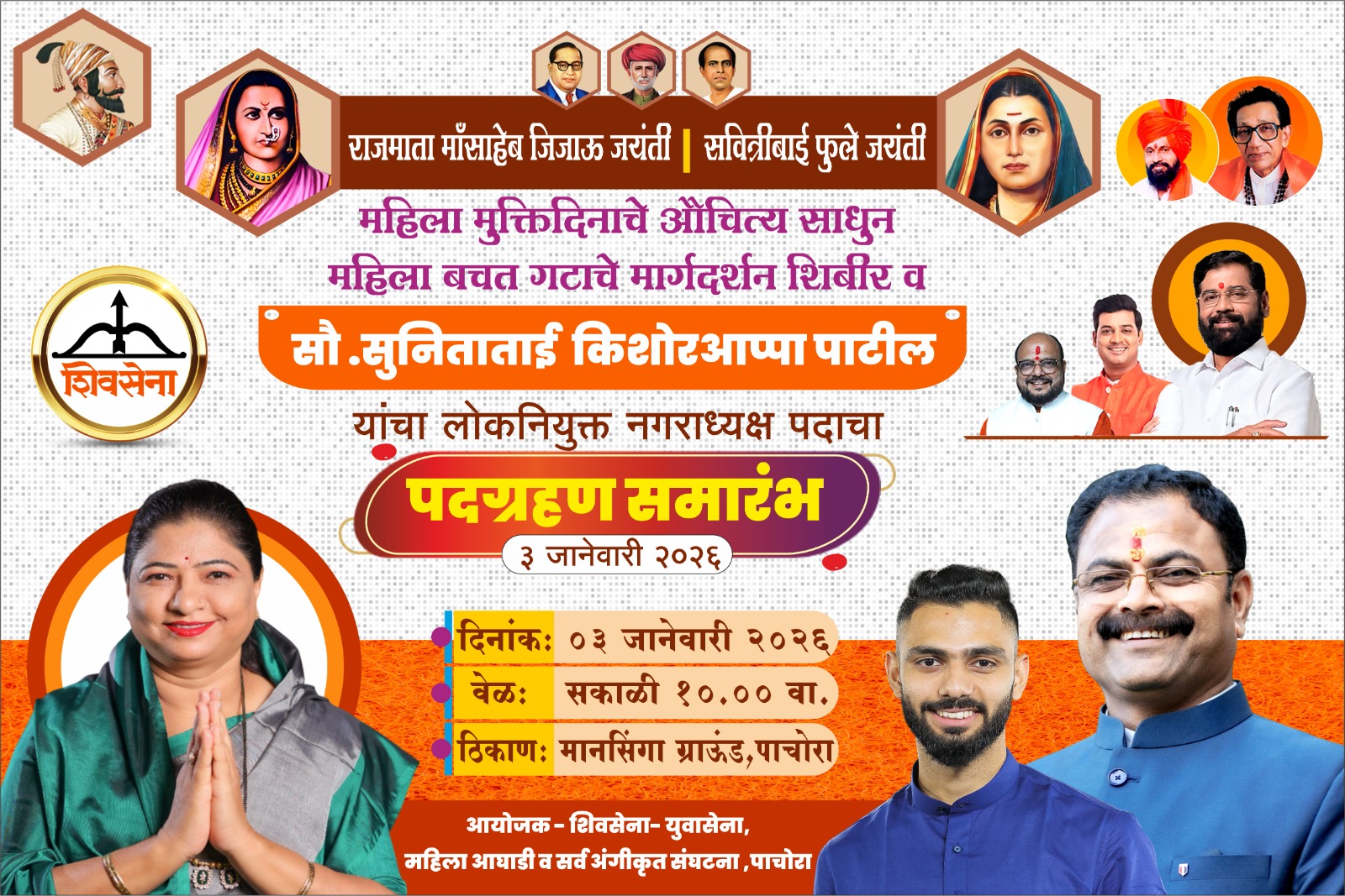 पाचोरा शहरात राजमाता माँसाहेब जिजाऊ जयंती, क्रांतिज्योती सावित्रीबाई फुले जयंती तसेच महिला मुक्तिदिनाचे औचित्य साधून उद्या आयोजित करण्यात येणारा लोकनियुक्त नगराध्यक्ष पदाचा पदग्रहण समारंभ हा केवळ राजकीय कार्यक्रम न राहता सामाजिक जाणीव आणि महिला सक्षमीकरणाचा ठोस संदेश देणारा ठरणार आहे. शिवसेनेच्या लोकनियुक्त नगराध्यक्ष सौ. सुनिताताई किशोर आप्पा पाटील यांच्या पदग्रहणानिमित्त पाचोरा शहरात उत्साहाचे वातावरण निर्माण झाले असून नागरिकांमध्ये मोठी अपेक्षा दिसून येत आहे. दिनांक ३ जानेवारी २०२६ रोजी सकाळी १० वाजता पाचोरा येथील मानसिंगा ग्राऊंड येथे हा भव्य पदग्रहण सोहळा पार पडणार आहे. या कार्यक्रमात महिला मुक्तिदिनाचे औचित्य साधून महिला बचत गटांसाठी विशेष मार्गदर्शन शिबीर आयोजित करण्यात आले असून महिलांच्या आर्थिक सक्षमीकरणावर विशेष भर देण्यात येणार आहे. महिलांनी स्वयंरोजगाराच्या माध्यमातून आर्थिकदृष्ट्या सक्षम व्हावे, स्वतःचे व कुटुंबाचे भविष्य सक्षमपणे घडवावे यासाठी बचत गटांचे महत्त्व, विविध शासकीय योजना, आर्थिक शिस्त आणि उद्योजकतेच्या संधी याबाबत मार्गदर्शन केले जाणार आहे. राजमाता जिजाऊ आणि सावित्रीबाई फुले यांच्या विचारांचा वारसा पुढे नेणाऱ्या या कार्यक्रमातून महिलांचे शिक्षण, स्वाभिमान आणि नेतृत्वक्षमतेचे महत्त्व अधोरेखित केले जाणार आहे. लोकनियुक्त नगराध्यक्ष पदाची शपथ स्वीकारताना सौ. सुनिताताई किशोर आप्पा पाटील या पाचोरा शहराच्या सर्वांगीण विकासासाठी कटिबद्ध राहण्याचा निर्धार व्यक्त करणार असून शहरातील मूलभूत सुविधा, स्वच्छता, पाणीपुरवठा, रस्ते, आरोग्य व शिक्षण या क्षेत्रात पारदर्शक आणि लोकाभिमुख कारभार करण्याची दिशा मांडणार आहेत. महिलांसाठी विशेष योजना प्रभावीपणे राबवून त्यांना निर्णयप्रक्रियेत सामावून घेण्यावर भर देण्यात येणार असल्याचेही त्या यावेळी स्पष्ट करणार आहेत. नगराध्यक्षपद हे अधिकाराचे नव्हे तर जबाबदारीचे पद असून नागरिकांच्या विश्वासाला पात्र ठरण्यासाठी प्रामाणिक प्रयत्न केले जातील, असा विश्वास या पदग्रहणाच्या माध्यमातून व्यक्त होणार आहे. या कार्यक्रमाचे आयोजन शिवसेना, युवासेना, महिला आघाडी व सर्व अंगीकृत संघटना, पाचोरा यांच्या वतीने करण्यात आले असून शिवसेनेच्या संघटनात्मक ताकदीचे दर्शन या सोहळ्यात घडणार आहे. विविध क्षेत्रातील मान्यवर, पदाधिकारी, महिला बचत गटांच्या प्रतिनिधी, शिवसैनिक आणि नागरिकांनी मोठ्या संख्येने उपस्थित राहावे, असे आवाहन आयोजकांच्या वतीने करण्यात आले आहे. पदग्रहण समारंभाची औपचारिकता आणि सामाजिक बांधिलकीतून महिलांसाठी मार्गदर्शन शिबीर असा दुहेरी उद्देश साधणा