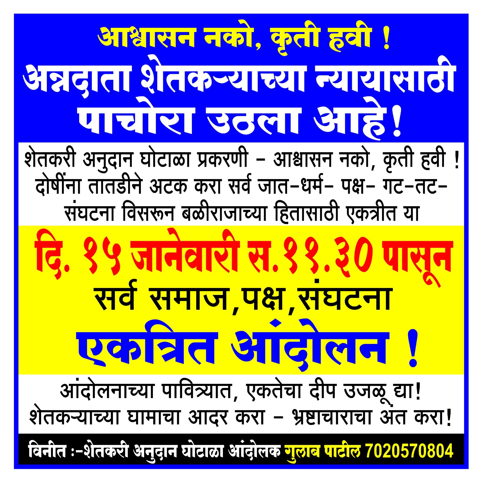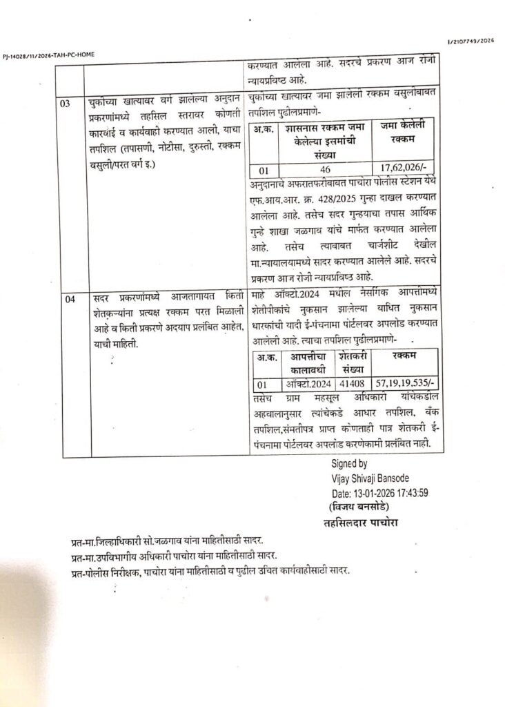पाचोरा -अनुदानासंदर्भात उद्या दिनांक 15 जानेवारी 2025 गुरुवारी सकाळी 11.30 वाजता प्रांताधिकारी कार्यालयासमोर गुलाबसिंग पाटील यांचे आमरण उपोषण तर संदीप महाजन यांचे शेतकरी बांधवांसोबत लाक्षणिक उपोषण होणार असल्याची ठाम भूमिका जाहीर झालेली असताना, या आंदोलनाच्या पार्श्वभूमीवर पाचोरा तहसील कार्यालयाने आज पत्रकार संदीप महाजन यांना एक सविस्तर व अधिकृत पत्र पाठवून सन 2019 पासून आजपर्यंतच्या शेतकरी अनुदान प्रकरणांबाबत आपली भूमिका स्पष्ट केली आहे. या पत्रामध्ये पाचोरा तालुक्यात अतिवृष्टी, नैसर्गिक आपत्ती, नुकसानभरपाई तसेच विविध शासकीय योजनांतर्गत देण्यात आलेल्या अनुदानासंदर्भात प्राप्त झालेल्या तक्रारी, चुकीच्या खात्यावर वर्ग झालेल्या रकमा, त्यावर करण्यात आलेली प्रशासकीय व कायदेशीर कार्यवाही तसेच सद्यस्थिती यांचा तपशील देण्यात आला असून, सदर पत्राची जशीच्या तशी प्रिंट प्रत बातमीसोबत जोडण्यात आली आहे. तहसीलदार तथा कार्यकारी दंडाधिकारी कार्यालयाकडून पाठवण्यात आलेल्या या पत्रानुसार, सन 2019 पासून आजपर्यंत प्राप्त झालेल्या तक्रारींची दखल घेऊन त्या वेळोवेळी संबंधित गावांच्या ग्राम महसूल अधिकारी यांच्याकडे तपासणीसाठी पाठवण्यात आल्या व उपलब्ध अधिकृत अभिलेखांच्या आधारे अनेक प्रकरणांचे निराकरण करण्यात आले असल्याचे स्पष्ट करण्यात आले आहे. तपासणीदरम्यान काही प्रकरणांमध्ये शेतकऱ्यांचे अनुदान चुकीच्या खात्यावर वर्ग झाल्याचे निदर्शनास आले असून, अशा एकूण 598 इसमांच्या खात्यावर 2 कोटी 7 लाख 50 हजार 597 रुपये इतकी रक्कम चुकीच्या पद्धतीने जमा झाल्याची नोंद कार्यालयीन स्तरावर असल्याचे पत्रात नमूद आहे. या गंभीर स्वरूपाच्या प्रकरणाची दखल घेऊन पाचोरा पोलीस स्टेशन येथे गुन्हा दाखल करण्यात आला असून हे प्रकरण सध्या न्यायप्रविष्ठ असल्याचेही तहसील कार्यालयाने स्पष्ट केले आहे. तसेच चुकीच्या खात्यावर जमा झालेल्या रकमेपैकी शासनाकडे वसुलीची कार्यवाही करत 46 इसमांकडून 17 लाख 62 हजार 26 रुपये इतकी रक्कम शासनाकडे जमा करण्यात आल्याची माहिती देण्यात आली आहे. अनुदानाच्या अफरातफरीप्रकरणी पाचोरा पोलीस स्टेशन येथे एफ.आय.आर. क्र. 428/2025 दाखल असून या गुन्ह्याचा तपास आर्थिक गुन्हे शाखा, जळगाव यांच्याकडून करण्यात येऊन संबंधित प्रकरणात मा. न्यायालयात चार्जशीट सादर करण्यात आलेली आहे, त्यामुळे या संपूर्ण प्रकरणात कायदेशीर प्रक्रिया सुरू असल्याचेही पत्रातून स्पष्ट होते. दरम्यान, आंदोलनकर्त्यांच्या भूमिकेनुसार केवळ खुलासे व आकडेवारी पुरेशी नसून, सन 2019 पासून आजपर्यंत शेतकऱ्यांना मंजूर झालेली एकूण रक्कम, प्रत्यक्ष अदा करण्यात आलेली रक्कम, अद्याप अदा न झालेल्या रकमा, तसेच ज्यांन