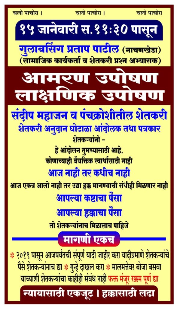 शेतकरी अनुदानापासून वंचित राहू नये, गुन्हा दाखल असो, कोर्टकचेरी सुरू असो, वसुलीची प्रक्रिया असो किंवा कोणत्याही प्रकारचे प्रशासकीय बोजे असोत, या प्रक्रियांशी शेतकऱ्यांचा थेट संबंध नसून यादीतील शेवटच्या घटकापर्यंत प्रत्येक पात्र शेतकऱ्याला संपूर्ण अनुदानाची रक्कम मिळालीच पाहिजे, अशी ठाम भूमिका आंदोलनकर्त्यांनी जाहीर केली आहे. तहसील कार्यालयाच्या पत्रामध्ये माहे ऑक्टोबर 2024 मधील नैसर्गिक आपत्तीमध्ये शेतीपिकांचे नुकसान झालेल्या शेतकऱ्यांचाही उल्लेख करण्यात आला असून, 41 हजार 408 नुकसानग्रस्त शेतकऱ्यांना एकूण 57 कोटी 19 लाख 19 हजार 535 रुपये इतक्या रकमेचे अनुदान मंजूर करून त्यांची यादी ई-पंचनामा पोर्टलवर अपलोड करण्यात आल्याचे नमूद आहे. ग्राम महसूल अधिकारी यांच्या अहवालानुसार आधार, बँक तपशील व संमतीपत्र प्राप्त असलेला कोणताही पात्र शेतकरी ई-पंचनामा पोर्टलवर अपलोड होण्यापासून प्रलंबित नसल्याचेही तहसील कार्यालयाने स्पष्ट केले आहे. एकीकडे तहसील प्रशासनाने अनुदान प्रकरणांतील कार्यवाही नियमांनुसार झाल्याचा दावा केला असताना, दुसरीकडे शेतकऱ्यांना प्रत्यक्ष रक्कम मिळेपर्यंत आंदोलन मागे न घेण्याचा निर्धार व्यक्त करण्यात आला असून, उद्या होणाऱ्या आमरण व लाक्षणिक उपोषणानंतर प्रशासन व आंदोलनकर्ते यांच्यातील पुढील घडामोडींकडे पाचोरा तालुक्यासह संपूर्ण जिल्ह्याचे लक्ष लागले आहे.