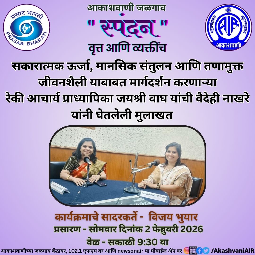 पाचोरा – बहुजनहिताय, बहुजनसुखाय या ब्रीदवाक्याला अनुसरून प्रसार भारती अंतर्गत कार्यरत असलेल्या आकाशवाणी जळगाव केंद्रावर श्रोत्यांसाठी नेहमीच समाजोपयोगी, सकारात्मक आणि मार्गदर्शक कार्यक्रम सादर केले जातात. याच परंपरेचा भाग म्हणून आकाशवाणी जळगाववरील ‘स्पंदन’ या विशेष कार्यक्रमात वृत्त आणि व्यक्तींच्या माध्यमातून सकारात्मक ऊर्जा, मानसिक संतुलन आणि तणावमुक्त जीवनशैली या विषयांवर आधारित एक महत्त्वपूर्ण मुलाखत प्रसारित होणार आहे. या कार्यक्रमात रेकी आचार्य प्राध्यापिका जयश्री कोमल वाघ (वर्मा) यांची विशेष मुलाखत घेण्यात येणार असून ही मुलाखत वैदेही नाखरे यांनी घेतलेली आहे. जीवनात सकारात्मक दृष्टिकोन कसा निर्माण करावा, मानसिक अस्वस्थतेवर कशी मात करावी, तसेच तणावमुक्त आणि संतुलित जीवनशैली कशी अंगीकारावी, याबाबत प्राध्यापिका जयश्री कोमल वाघ (वर्मा) श्रोत्यांना सविस्तर मार्गदर्शन करणार आहेत. आजच्या वेगवान आणि स्पर्धात्मक युगात प्रत्येक व्यक्ती मानसिक तणाव, चिंता, नैराश्य आणि अस्वस्थतेला सामोरी जात आहे. कामाचा ताण, कौटुंबिक जबाबदाऱ्या, सामाजिक अपेक्षा आणि सततची धावपळ यामुळे मानसिक आरोग्याकडे दुर्लक्ष होत आहे. अशा परिस्थितीत अंतर्मुख होणे, स्वतःशी संवाद साधणे आणि सकारात्मक ऊर्जेचा योग्य वापर करणे अत्यंत आवश्यक आहे, असे मत त्या व्यक्त करणार आहेत. रेकी ही केवळ उपचारपद्धती नसून ती एक जीवनशैली असल्याचे त्या सांगणार आहेत. औषधांशिवाय, नैसर्गिक ऊर्जेच्या माध्यमातून मानसिक शांतता, आत्मविश्वास आणि भावनिक स्थैर्य मिळवणे शक्य आहे. रेकीच्या सरावामुळे मनातील नकारात्मक विचार दूर होतात, आत्मशक्ती जागृत होते आणि जीवनाकडे पाहण्याची दृष्टी सकारात्मक बनते, याविषयी त्या सोप्या आणि सहज शब्दांत माहिती देणार आहेत. या मुलाखतीत त्या आपल्या वैयक्तिक अनुभवांद्वारे रेकीचा उपयोग कसा करता येतो, दैनंदिन जीवनात मानसिक संतुलन कसे राखता येते, तसेच तरुण पिढीने तणावमुक्त जीवनासाठी कोणत्या सवयी अंगीकाराव्यात, यावर विशेष भर देणार आहेत. विशेषतः आजच्या तरुणांमध्ये वाढत चाललेल्या तणाव, अपयशाची भीती आणि अस्थिरतेवर मात करण्यासाठी आत्मविश्वास, संयम आणि सकारात्मक ऊर्जा किती आवश्यक आहे, हे त्या अधोरेखित करणार आहेत. प्राध्यापिका जयश्री कोमल वाघ (वर्मा) या जिल्हा मध्यवर्ती बँकेचे माजी व्यवस्थापक मधुकरअण्णा ओंकार वाघ यांच्या स्नुषा असून श्री गो से हायस्कूलच्या माजी मुख्याध्यापिका सौ. प्रमिला मधुकर वाघ यांची सून आहेत. तसेच त्या कोमल मधुकर वाघ यांची पत्नी आहेत. संस्कार, शिक्षण आणि सामाजिक जाणिवांनी समृद्ध असलेल्या या कुटुंबातील मूल्यांचा त्यांच्या विचारसरणीवर आणि क