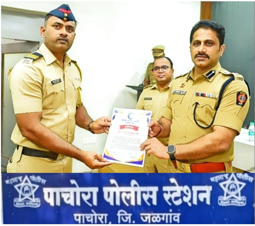 पाचोरा – पाचोरा पोलीस स्टेशन येथे कार्यरत असलेले पोलीस हेड कॉन्स्टेबल क्रमांक ६२५ राहुल काशिनाथ शिंपी यांनी गुन्हे तपासात दाखवलेली तत्परता, जबाबदारीची जाणीव आणि कर्तव्यनिष्ठ सेवा याची दखल घेत जळगाव जिल्हा पोलीस अधीक्षक महेश्वर रेड्डी यांनी त्यांना प्रशस्तिपत्र प्रदान करून गौरव केला आहे. गुन्ह्यांचा वेगाने तपास पूर्ण करणे, हरवलेल्या अल्पवयीन बालकाचा शोध घेणे आणि न्यायालयीन प्रक्रियेत दाखवलेली कार्यक्षमता यामुळे राहुल काशिनाथ शिंपी यांची कामगिरी जिल्हा पोलीस प्रशासनाच्या दृष्टीने उल्लेखनीय ठरली आहे.