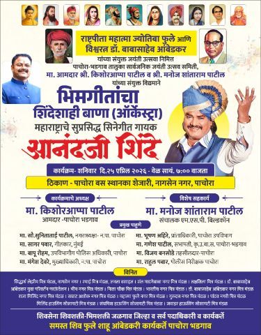 घेण्यासाठी उपस्थित राहतील, अशी अपेक्षा व्यक्त केली जात आहे. या कार्यक्रमाच्या अध्यक्षस्थानी आमदार हे राहणार असून, एम एस पी बिल्डकॉनचे मनोज पाटील यांचे या उपक्रमासाठी विशेष सहकार्य लाभले आहे. सामाजिक समता, बंधुता आणि न्याय यांसारख्या मूल्यांचा प्रसार करण्यासाठी आयोजित केलेला हा कार्यक्रम केवळ मनोरंजनापुरता मर्यादित न राहता सामाजिक जागृतीचे प्रभावी माध्यम ठरणार आहे, असे आयोजकांचे मत आहे. भीमगीतांचा इतिहास हा केवळ संगीतापुरता मर्यादित नसून तो एका सामाजिक चळवळीचा आवाज आहे. डॉ. बाबासाहेब आंबेडकर यांच्या विचारांना लोकांपर्यंत पोहोचवण्यासाठी भीमगीतांनी मोठी भूमिका बजावली आहे. याच परंपरेला पुढे नेत आनंद शिंदे यांनी आपल्या दमदार आणि प्रभावी आवाजातून समाजातील अन्याय, विषमता आणि शोषणाविरुद्ध लढण्याची प्रेरणा दिली आहे. त्यांच्या गाण्यांमधील शब्द हे केवळ काव्य नसून ते समाजातील प्रत्येक घटकाला जागृत करणारे विचार आहेत. त्यामुळेच त्यांच्या कार्यक्रमाला सर्व स्तरातील नागरिक मोठ्या उत्साहाने प्रतिसाद देतात. पाचोरा भडगाव तालुक्यात राष्ट्रपिता महात्मा फुले आणि डॉ. बाबासाहेब आंबेडकर यांच्या संयुक्त जयंतीनिमित्त विविध सामाजिक आणि सांस्कृतिक कार्यक्रमांचे आयोजन करण्यात येत आहे. त्याच पार्श्वभूमीवर या भीमगीतांच्या कार्यक्रमाचे आयोजन करण्यात आले असून, स्थानिक सामाजिक कार्यकर्ते आणि आंबेडकरी संघटनांनी यासाठी विशेष पुढाकार घेतला आहे. या कार्यक्रमामुळे केवळ सांस्कृतिक रंगत वाढणार नसून समाजात एकात्मतेचा आणि समतेचा संदेश अधिक दृढ होणार आहे. कार्यक्रमस्थळी उत्तम ध्वनी व्यवस्था, श्रोत्यांसाठी व्यवस्थित बसण्याची सोय तसेच सुरक्षेची काटेकोर व्यवस्था करण्यात येणार आहे. मोठ्या प्रमाणावर नागरिकांची उपस्थिती अपेक्षित असल्याने वाहतूक आणि शिस्त राखण्यासाठी प्रशासनाकडूनही विशेष नियोजन करण्यात आले आहे. या कार्यक्रमाच्या यशस्वी आयोजनासाठी विविध समित्या कार्यरत असून प्रत्येक घटकावर बारकाईने लक्ष दिले जात आहे. या भव्य सोहळ्यास अनेक मान्यवरांची उपस्थिती लाभणार आहे. प्रसिद्ध गीतकार सागर पवार, पाचोरा नगराध्यक्ष सुनीता पाटील, उपविभागीय अधिकारी भूषण अहिरे, गटनेते सुमित पाटील, बाजार समिती सभापती गणेश पाटील, उपविभागीय पोलिस अधिकारी बापू रोहम, तहसीलदार विजय बनसोडे, मुख्याधिकारी मंगेश देवरे, पोलिस निरीक्षक राहुल कुमार पवार, आगार व्यवस्थापक प्रकाश पाटील यांच्यासह विविध क्षेत्रातील मान्यवर या कार्यक्रमाला उपस्थित राहून या उपक्रमाला गौरव देतील. भीमगीतांच्या माध्यमातून समाजातील तळागाळातील लोकांपर्यंत विचार पोहोचवण्याची ताकद प्रचंड आहे. अशा कार्